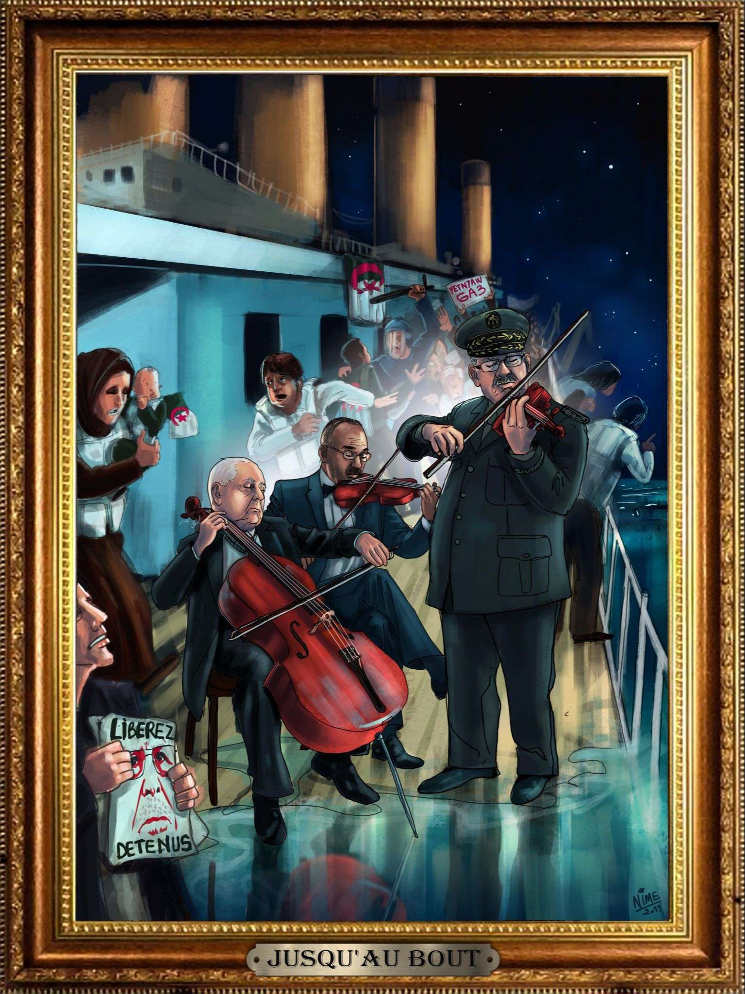 “Hasta el final”. Políticos y militares representados por Nime como “la banda del Titanic” que sigue tocando, ajena a la represión en Argelia.