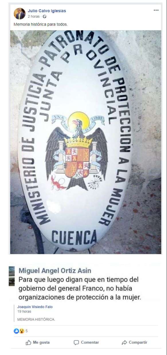 No he encontrado referencias a la rueda de prensa en cuestión, lo que si he visto es que el concejal, en su cuenta de Facebook, sigue diciendo que no es libertad, que es un insulto. Pero para compensar, recuerda a la mujer en un alegato de defensa de la memoria histórica para todos digno del más puro arte facha compartiendo esto.