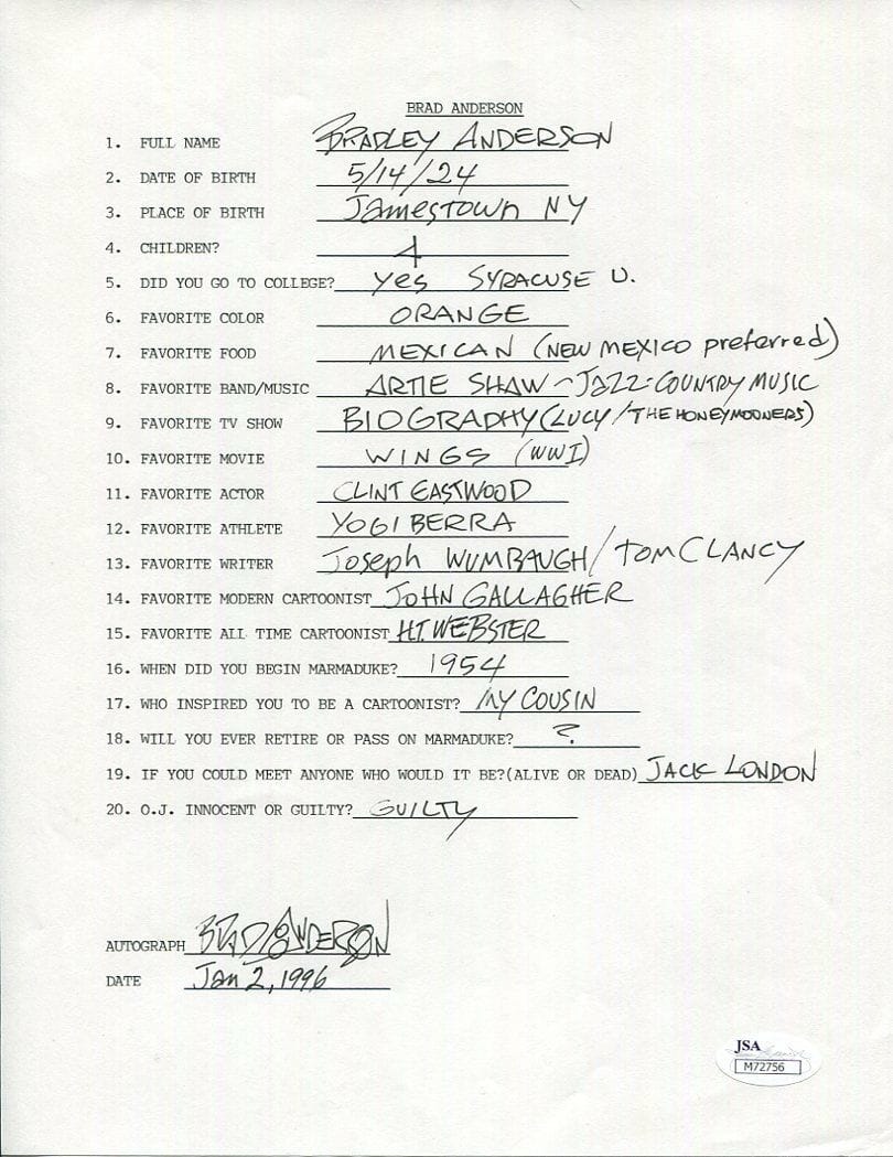 Brad Anderson (1924- 2015). Entre 1954 y 1966, dibujó la tira cómica “Grandpa’s Boy”, sin embargo es más conocido por su tira del gran danés de nombre “Marmaduke“, que dibujó desde 1954 hasta que falleció a los 91 años.