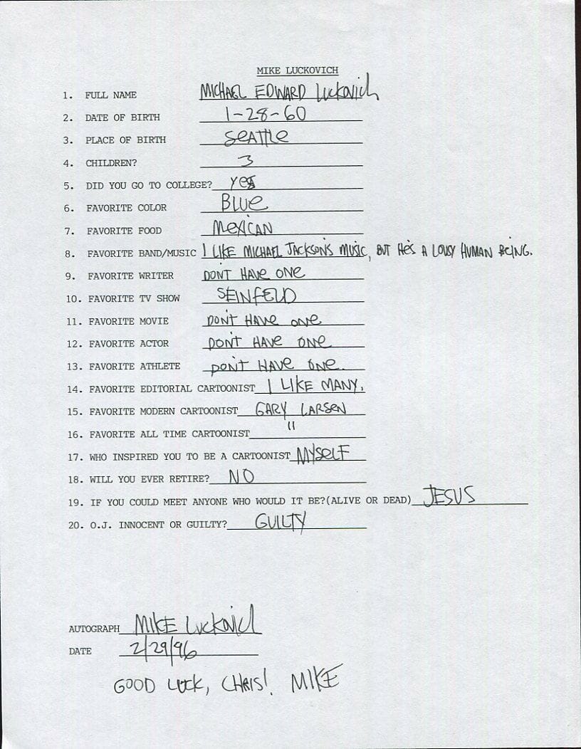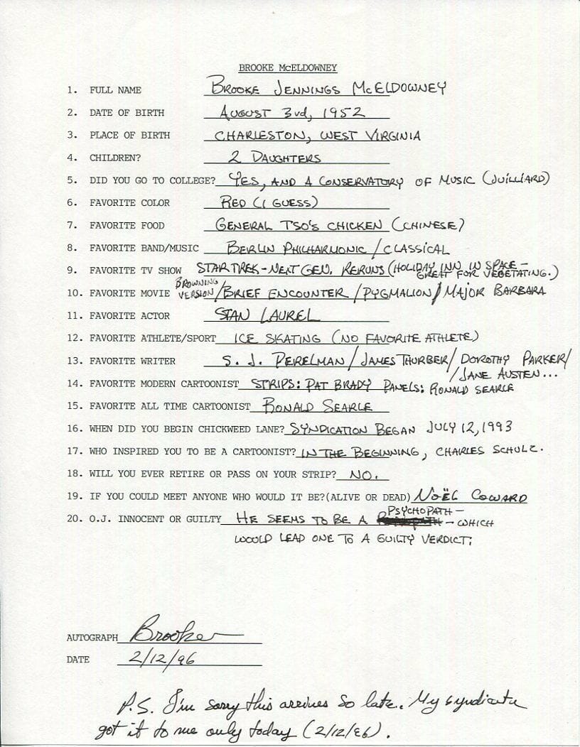 Lynch, que encontró las imágenes de Ebay, desconoce la historia detrás de estos cuestionarios. Deduce que, debido a que las hojas no muestran marcas de haber sido dobladas para ser enviadas por correo postal en un sobre, pudieron haber sido rellenadas durante al menos un par de eventos en los que el tal Crhis se acercó a los dibujantes para pedirles que contestaran a la “entrevista”.