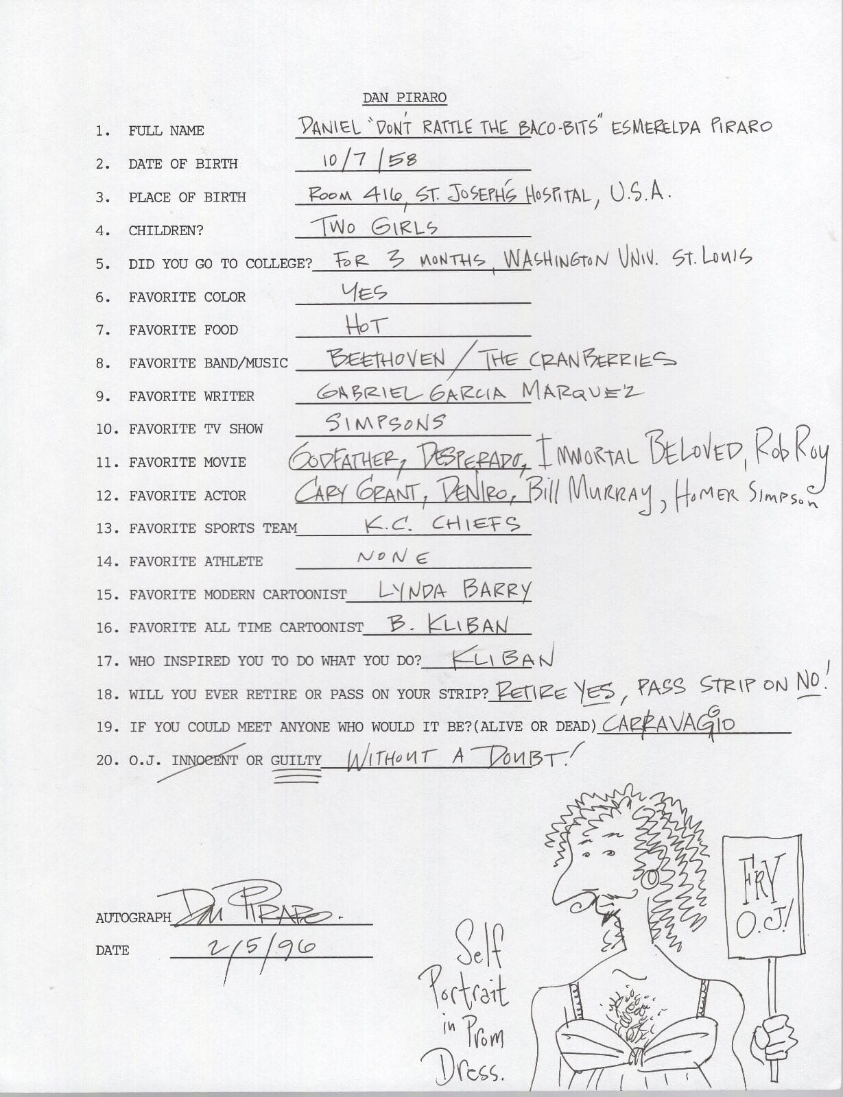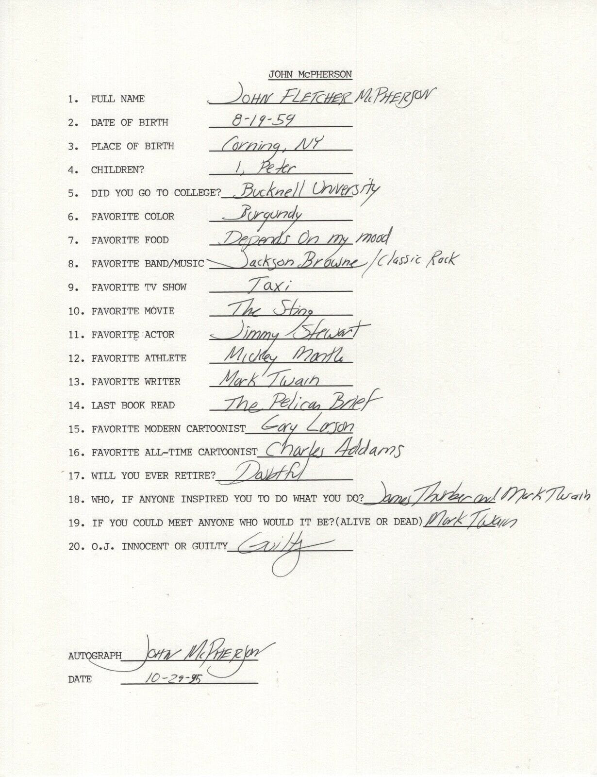 Resulta interesante la lectura de las contestaciones juntas porque dejan algunos datos biográficos de valor. Más allá de las muy irrelevantes (la mitad eligen el color azul como favorito) o de conocer si consideraban que O. J. Simpson era culpable o no, se pueden conocer las películas, programas de televisión, atletas, músicos y escritores que les gustaban.