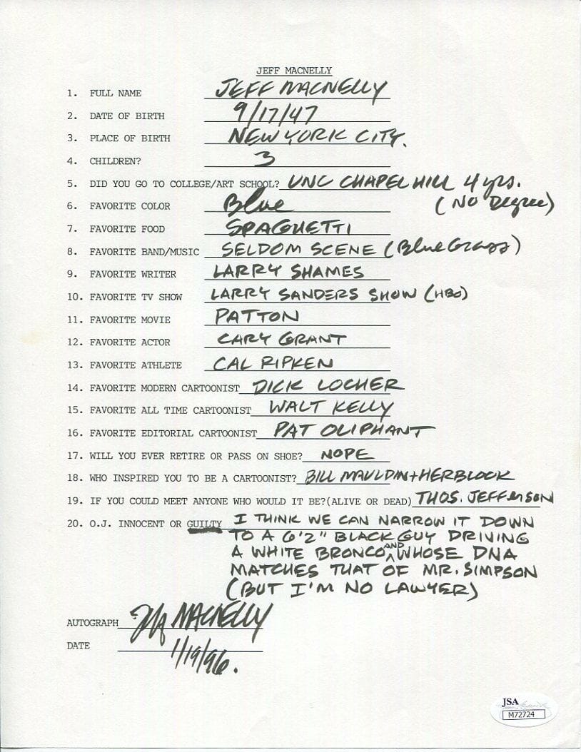 Jeff MacNelly (1947 – 2000). Brillante viñetista creador de la tira “Shoe”. Empezó a trabajar en el Chicago Tribune en 1982 y continuó acumulando reconocimiento en su campo, hasta conseguir tres premios Pulitzer (1976, 1978 y 1985) por sus viñetas y siendo nombrado “el mejor en el negocio” entre los dibujantes políticos en 1987, 1989 y 1993. En 1991 ganó el premio Sigma Delta Chi National Premio a la caricatura editorial. La National Cartoonists Society le otorgó dos veces su más alto honor, el Premio Reuben.