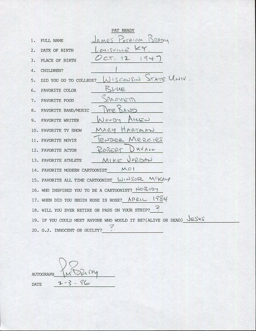 Pat Brady (1947) guioniza y dibuja la historieta “Rose is Rose” desde 1984 hasta 2004, cuando el dibujante Don Wimmer toma el relevo.