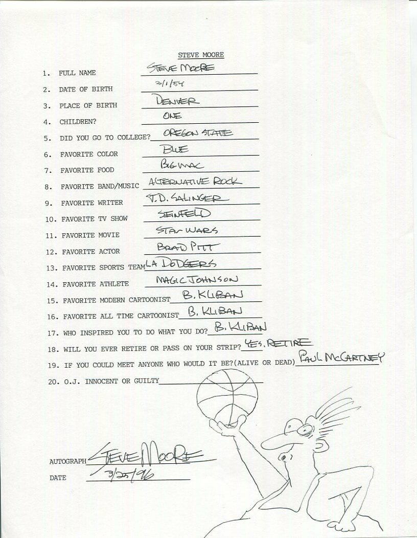 Steve Moore (1965*). Guionista, productor y director de cine, fue dibujante de la viñeta deportiva “In the Bleachers” desde 1985. También conocido por la franquicia de animación “Open Season” y la película “Alpha and Omega”.