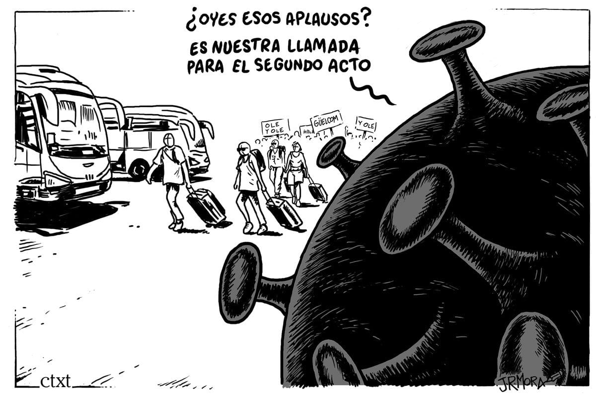 Aunque se publicó el domingo, dibujé el cuadrulo el viernes por la noche con la esperanza de tener que comérmela, pero lo que sólo parecía bastante evidente dejó de serlo a las pocas horas para confirmarse. Aunque nos venden que los rebrotes son leves, si algo de esto no te produce un poco de desasosiego, manque sea, es que estás muerto por dentro.