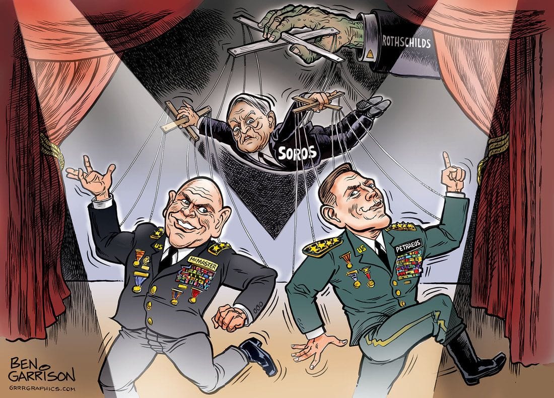 Viñeta que se comenta en el artículo de ADL titulada “Soros Puppets” (Las marionetas de Soros), publicada en la web del autor en 2017. Bajo la imagen, el autor admite que fue un encargo de Mike Cernovich, pero Garrison siempre negó que hubiera un mensaje antisemita en su crítica contra David Petraeus y H.R. McMaster, Soros y la familia Rothschilds.