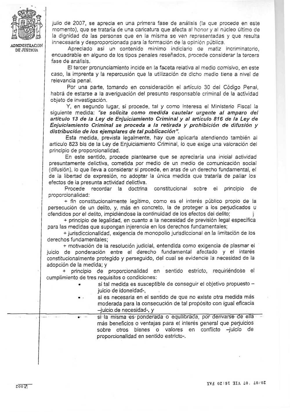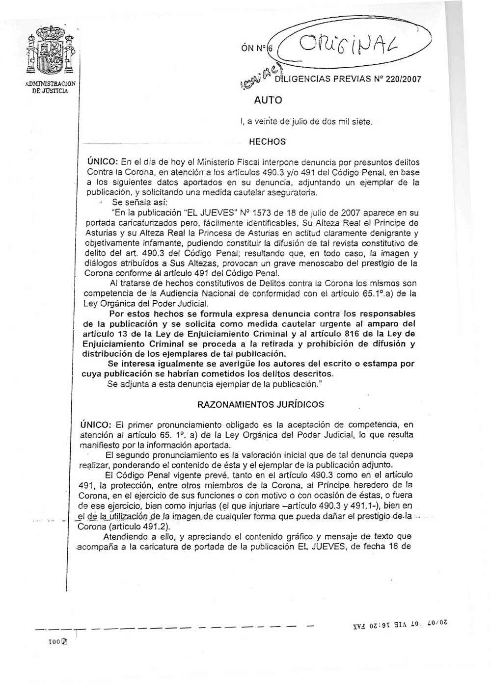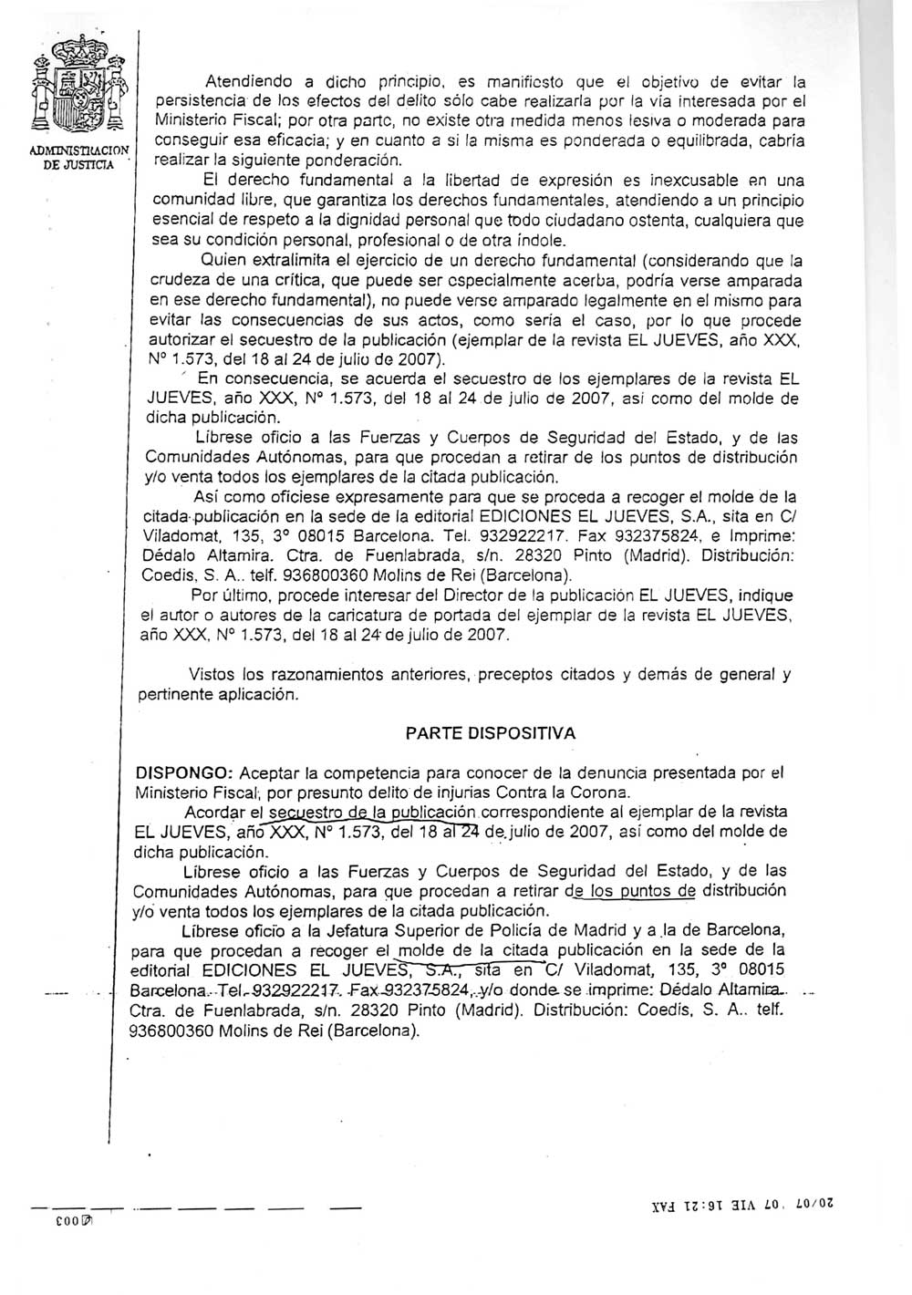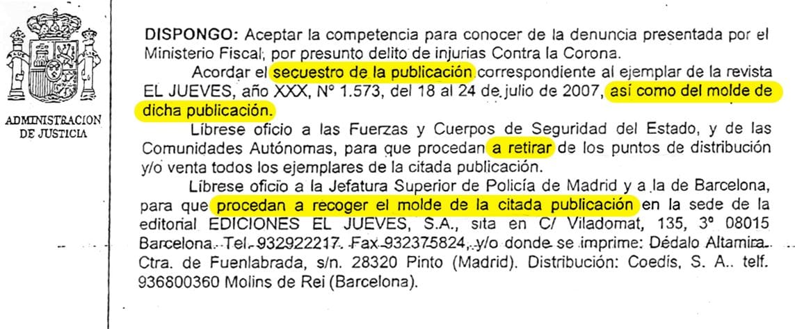 Auto por el que se ordena el secuestro de una edición de El Jueves, proceso que terminaría en condena para dos dibujantes por un chiste sobre Felipe y Letizia.