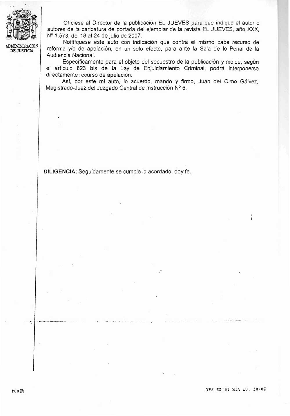 El 20 de julio de 2007 el juez del Olmo ordenó secuestrar el número 1.573 de la revista El Jueves (ver auto) y solicitó que se retiraran todos los ejemplares de los puntos de venta, el motivo fue su portada.