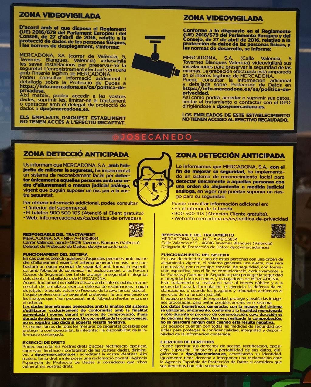 Cartel informativo sobre el sistema de reconocimiento facial en un supermercado del Coll d’en Rabassa (Palma) – Islas Baleares. Fotografía de @josecanedo_.Otro cartel en otro punto de Baleares.