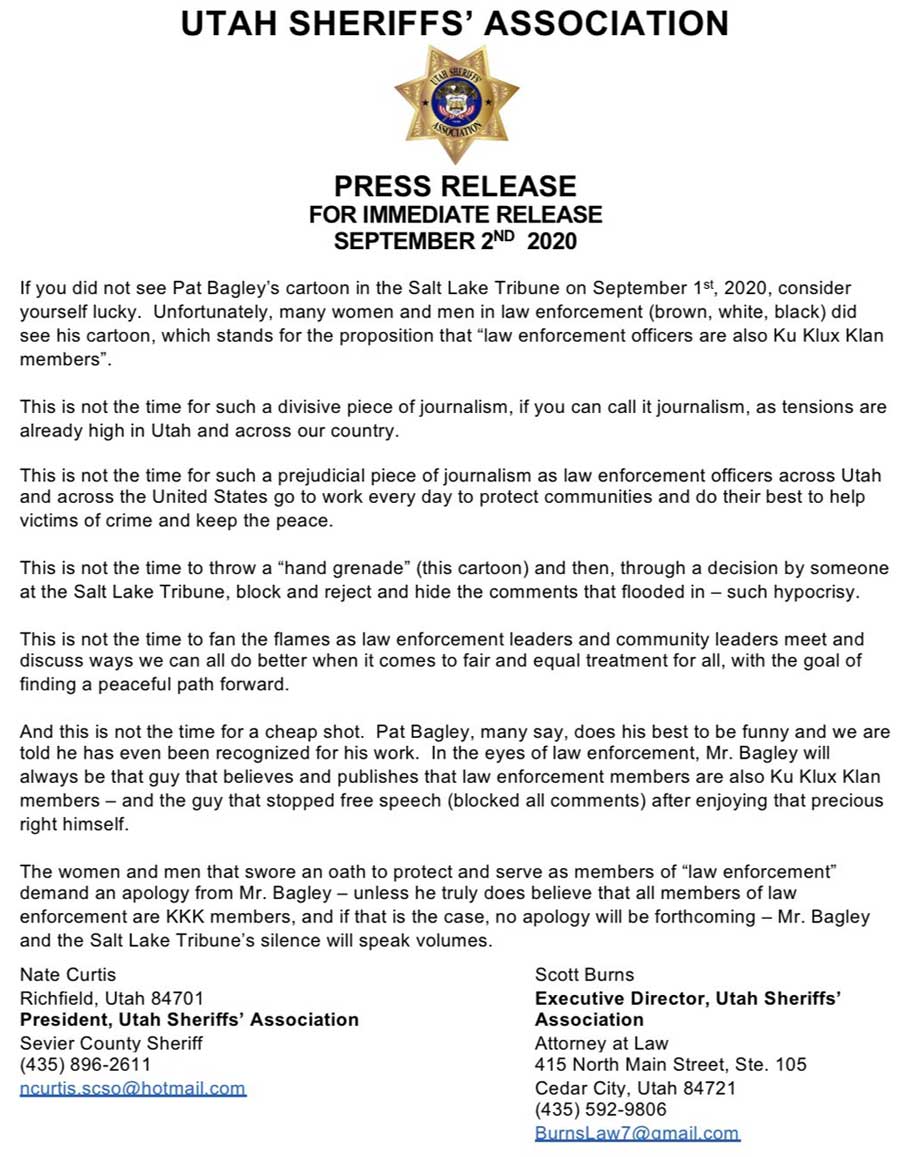 «Si no vio la viñeta de Pat Bagley en el Salt Lake Tribune el 1 de septiembre de 2020, considérese afortunado. Desafortunadamente, muchas mujeres y hombres en las fuerzas del orden (morenos, blancos, negros) vieron su viñeta, que presenta la proposición de que «los agentes del orden también son miembros del Ku Klux Klan«.